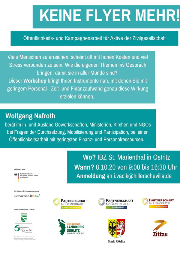 Der Workshop von Wolfgang Nafroth “Keine Flyer mehr!” über die Öffentlichkeits- und Kampagnenarbeit für Aktive der Zivilgesellschaft findet am 8. Oktober 2020 von 9:00 bis 16:30 im IBZ St. Marienthal (Sankt Marienthal 10, 02899 Ostritz) statt.